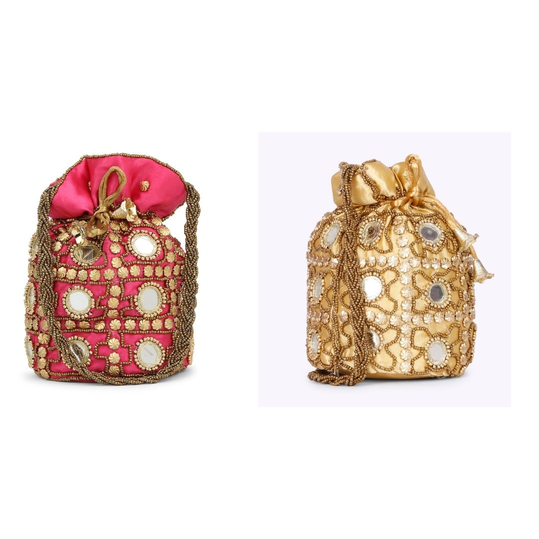 This product is a combo of tow Embellished potli bags having wrist loop 1 main compartment each with drawstring closure. Size & Fit Size of each potli bag : 9 x 9 x 3 Inch (Length x Width x Depth ) Material & Care Fabric Wipe with clean, dry cloth