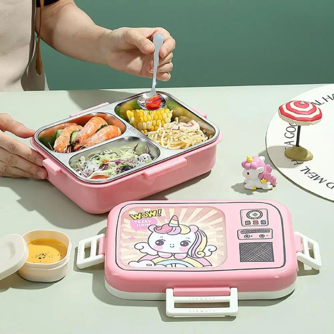 This Kids Printed Stainless Steel Lunch Box features 3 divided sections to keep food neatly separated. With fun prints and a leak-proof design, it?s perfect for school lunches?durable, hygienic, and easy for kids to carry.